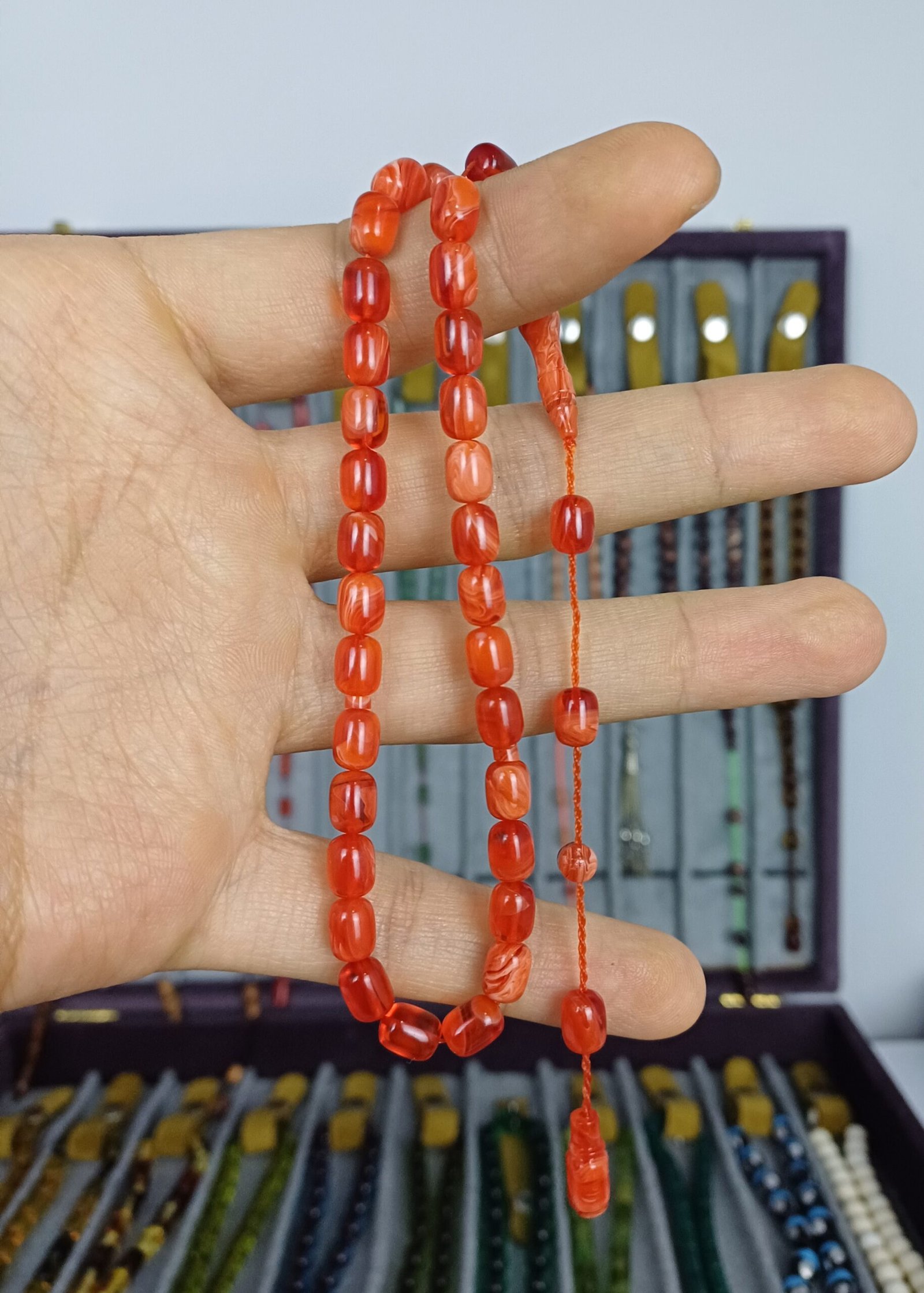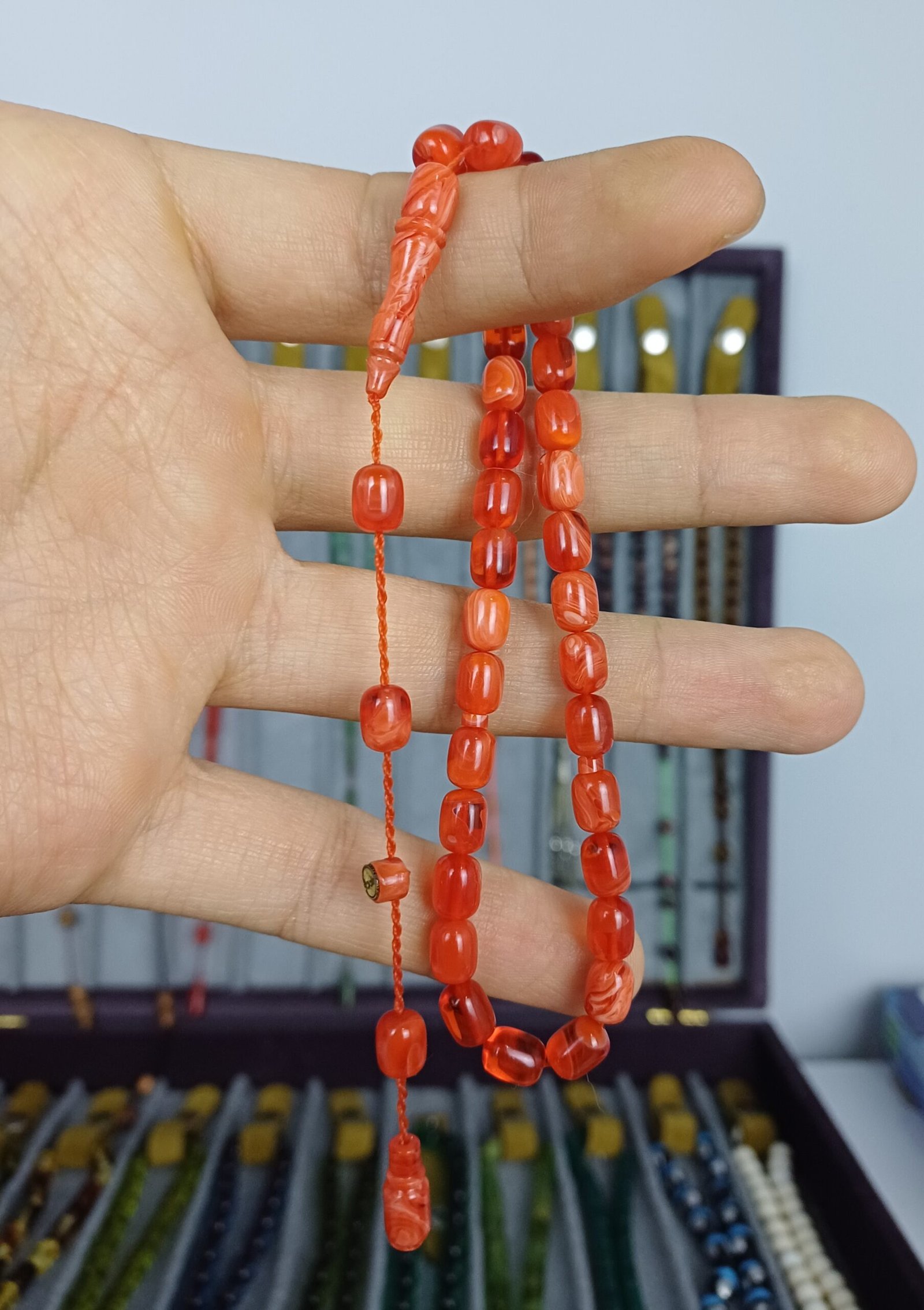 Muhammed Tacir Usta’nın ustalığıyla hayat bulan bu ürün, Türk el sanatı geleneğinin güzelliklerini modern hayata taşır. Her tanesi el emeği ve göze hitap eden pürüzsüzlüğüyle elinizden düşürmek istemeyeceğiniz bir parça haline gelir. Özellikle hediye olarak da mükemmel bir seçim olan bu tesbih, zarafeti ve kalitesiyle değer katar.